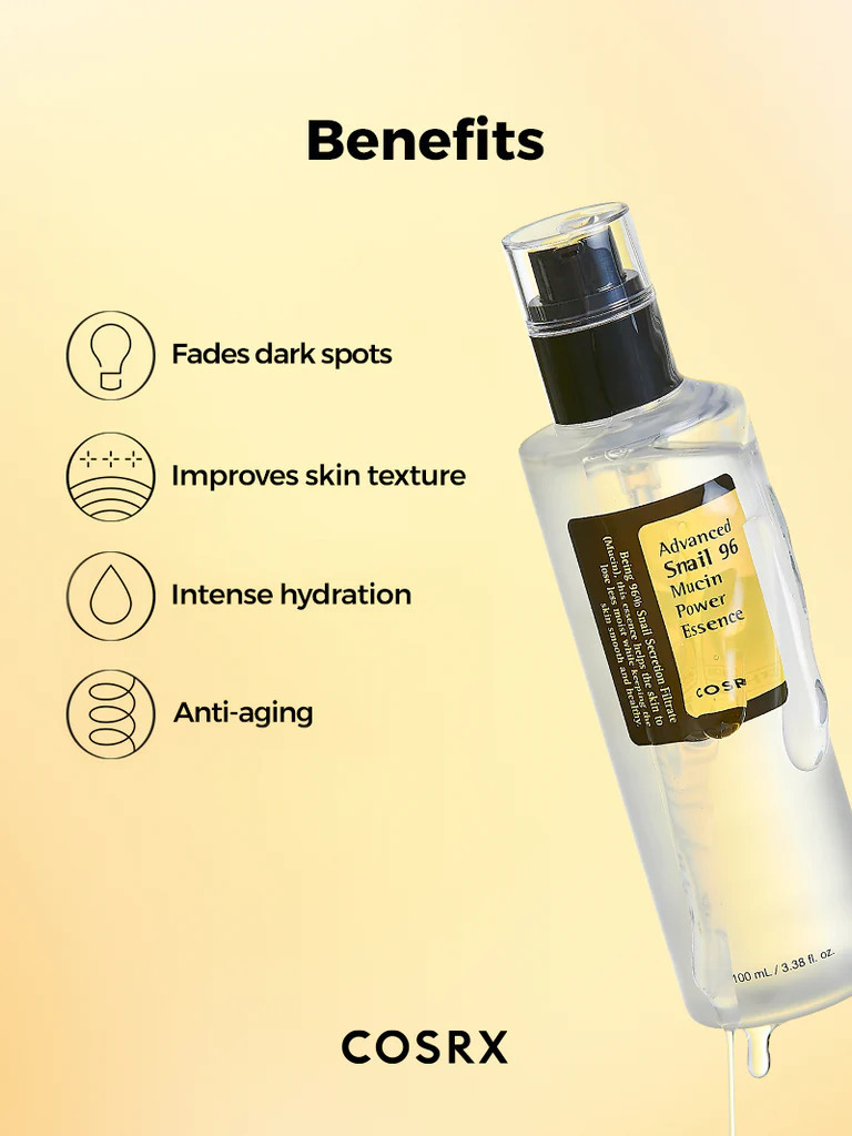 Το COSRX Advanced Snail 96 Mucin Power Essence 100ml είναι ένα ελαφρύ essence προσώπου με 96% snail secretion filtrate, σχεδιασμένο για βαθιά ενυδάτωση, βελτίωση της υφής και πιο λαμπερή όψη επιδερμίδας. Η επίσημη σελίδα της COSRX το παρουσιάζει ως προϊόν για όλους τους τύπους δέρματος, ιδιαίτερα για ευαίσθητη ή ταλαιπωρημένη επιδερμίδα, με στόχο την ενίσχυση του skin barrier και ένα “glass skin” αποτέλεσμα.