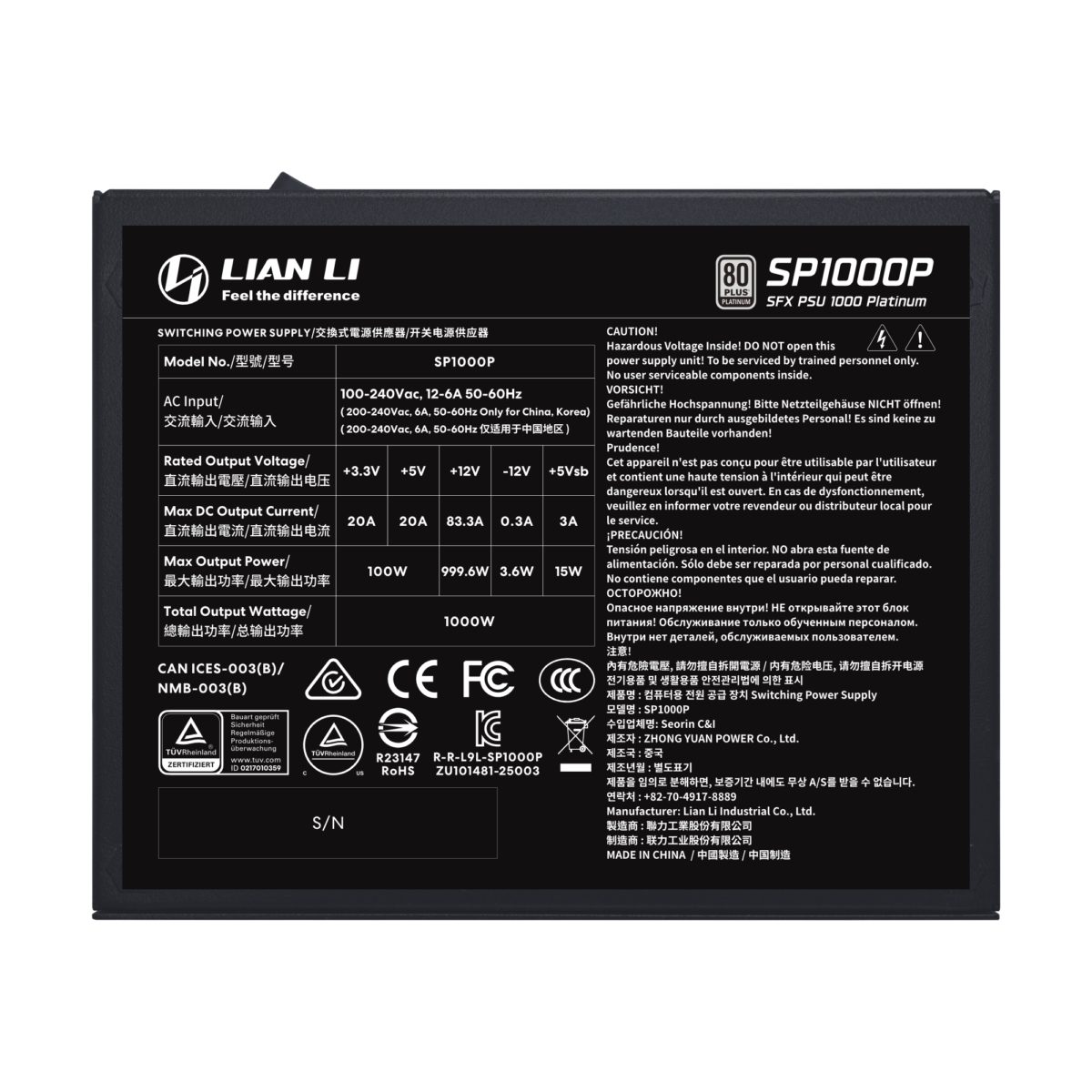 LIAN LI SP1000P Black -1000W 80+ Platinum PSU - 10 Years Warranty - 12V-2?6 - Japanese Capacitors - LIAN LI 2.35.65.02.042